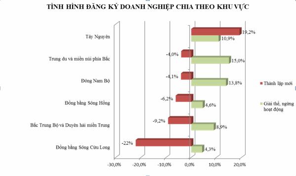 Trong khi đó, cộng đồng doanh nghiệp tại các vùng Đồng bằng sông Hồng; Trung du và miền núi phía Bắc; Bắc Trung Bộ và Duyên hải miền trung; Đông Nam Bộ và Đồng bằng sông Cửu Long vẫn thể hiện một bức tranh còn nhiều khó khăn khi số lượng doanh nghiệp thành lập mới tiếp tục giảm, đồng thời số doanh nghiệp gặp khó khăn phải giải thể hoặc tạm ngừng hoạt động tăng so với cùng kỳ năm trước.