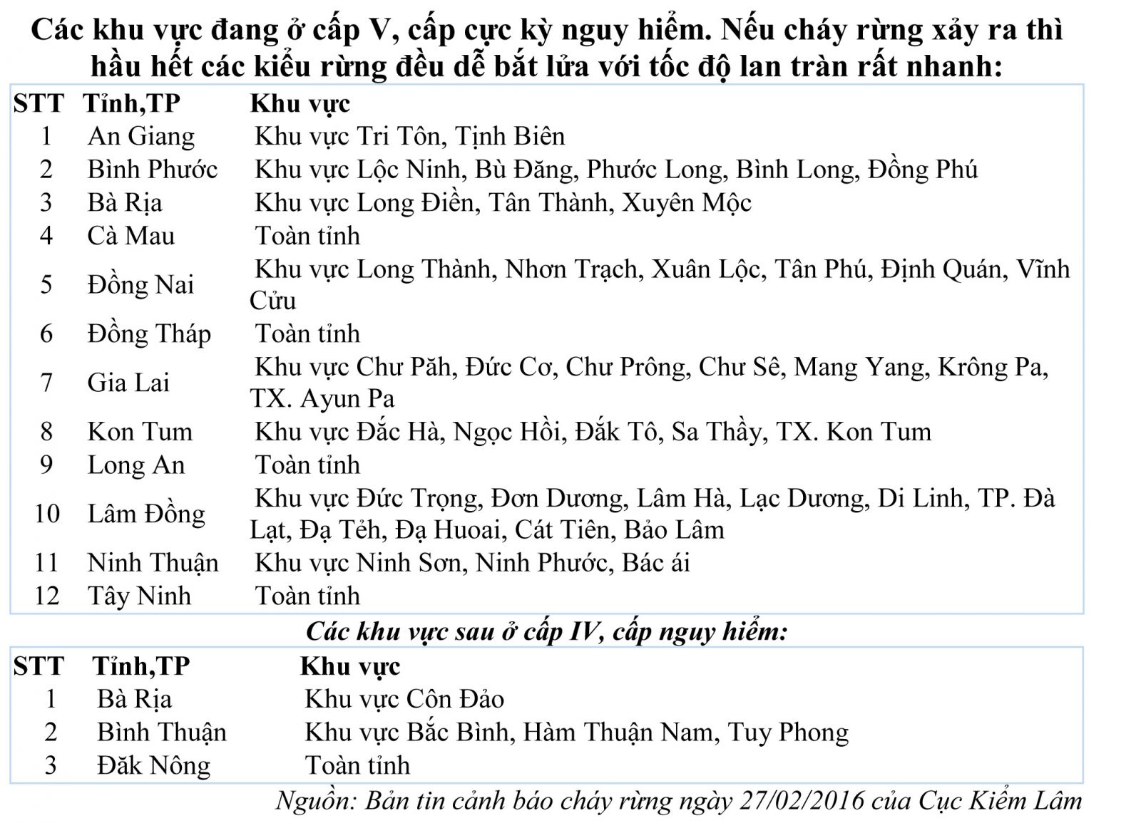 Theo Tổng cục Lâm nghiệp, Bộ Nông nghiệp và Phát triển nông thôn, do mùa khô năm nay quá khắc nghiệt, tình trạng nắng nóng, khô hạn kéo dài đã khiến lớp thảm thực vật ở hàng loạt cánh rừng tại miền Trung, Tây Nguyên và Nam Bộ khô trắng, cây cối xác xơ, nguy cơ xảy ra cháy rừng là rất cao. Đáng chú ý, có 12 tỉnh nằm trong mức độ cảnh báo cấp 5 - cấp cực kỳ nguy hiểm.