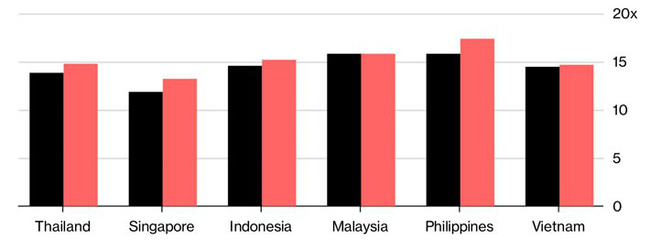 Cổ phiếu của Philippines, Singapore và Thái Lan là những cổ phiếu rẻ nhất so với 3 năm qua (Màu đen là mức của 12 tháng hiện tại, màu đỏ là mức trung bình của 3 năm. Đơn vị: lần - Nguồn: Bloomberg)