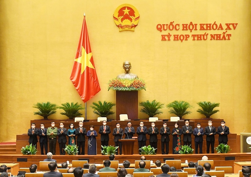 | 18 Ủy viên Ủy ban Thường vụ Quốc hội khóa XV ra mắt Quốc hội. Ảnh: QH |