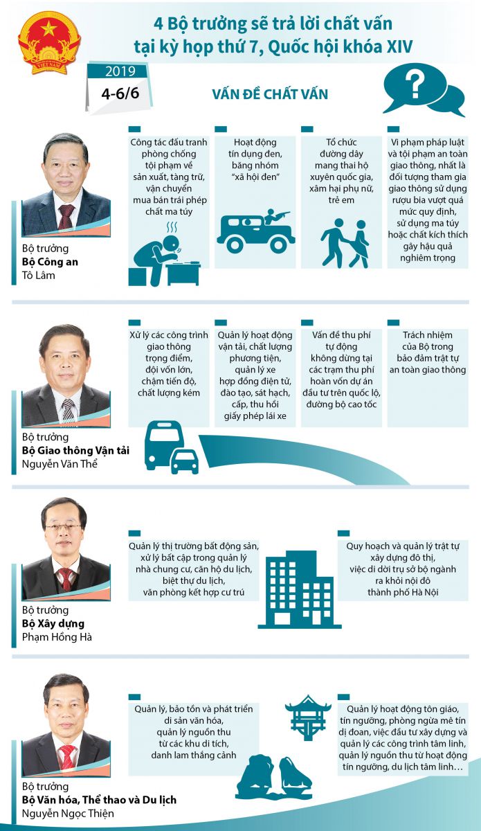 Theo thông tin từ Văn phòng Quốc hội, thì phiên chất vấn và trả lời chất vấn tại kỳ họp này sẽ được tiến hành trong 2,5 ngày, từ ngày 04-06/6 với 4 bộ trưởng sẽ chịu trách nhiệm trả lời chất vấn 4 nhóm vấn đề tại Kỳ họp thứ 7, Quốc hội khóa XIV.