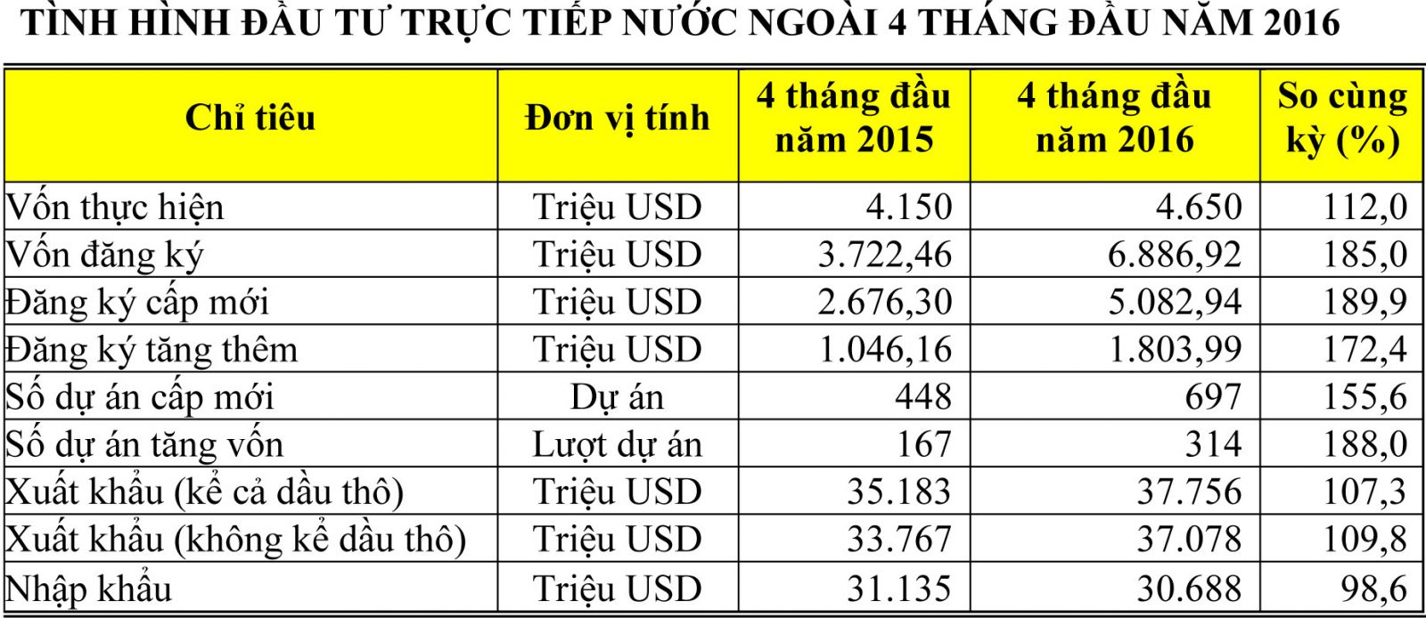 Tính chung trong 4 tháng đầu năm 2016, tổng vốn đăng ký cấp mới và tăng thêm là 6,88 tỷ USD, tăng 85% so với cùng kỳ năm 2015.