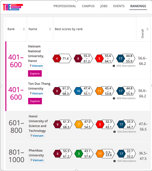 Việt Nam có 4 cơ sở có tên trong THE Impact Rankings 2021, gồm: Đại học Quốc gia Hà Nội (vị trí 401-600), Trường Đại học Tôn Đức Thắng (401-600), Trường Đại học Bách khoa Hà Nội (601-800) và Trường Đại học Phenikaa (801-1000).