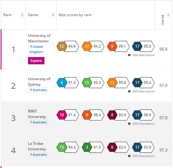 Bảng xếp hạng THE Impact Rankings 2021 có 1.115 đại học đến từ 94 quốc gia và vùng lãnh thổ tham gia. Đứng đầu Bảng xếp hạng năm nay là Đại học Manchester (Vương quốc Anh), tiếp đến là 3 trường đại học của Australia: Sydney, RMIT và La Trobe./.