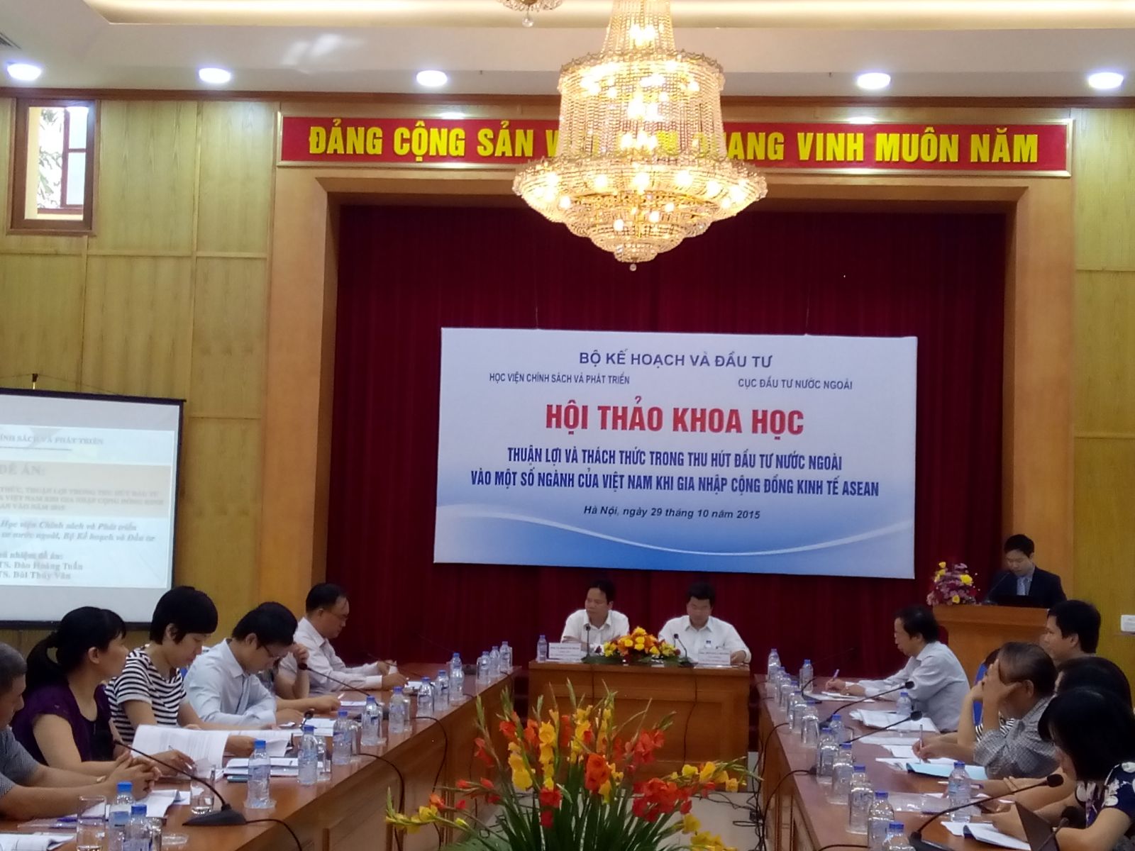 Đó là nhận định của PGS, TS. Đào Văn Hùng, Giám đốc Học viện Chính sách và Phát triển tại buổi Hội thảo khoa học “Thuận lợi và thách thức trong thu hút đầu tư nước ngoài vào một số ngành của Việt Nam khi gia nhập Cộng đồng Kinh tế ASEAN”, ngày 29/10/2015 do Học viện Chính sách và Phát triển và Cục Đầu tư nước ngoài tổ chức.