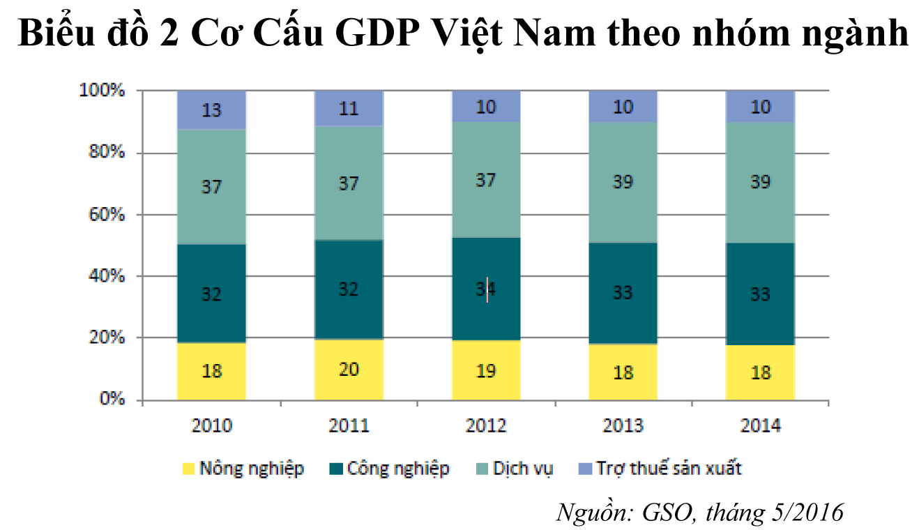 GDP. Tăng trưởng GDP của Việt Nam trong thập niên vừa qua đạt trung bình 13% mỗi năm, riêng năm 2015 đạt 6,7%. Tổng cục Thống kê dự đoán mức tăng trưởng trong năm 2016 và năm 2017 lần lượt đạt 6,6% và 6,7%. Trong năm 2015, khối xây dựng và công nghiệp đóng góp lớn nhất, chiếm 3,2% tăng trưởng GDP, theo sau là khối dịch vụ với 2,4% và nông nghiệp 0,4% (Biểu đồ 1).