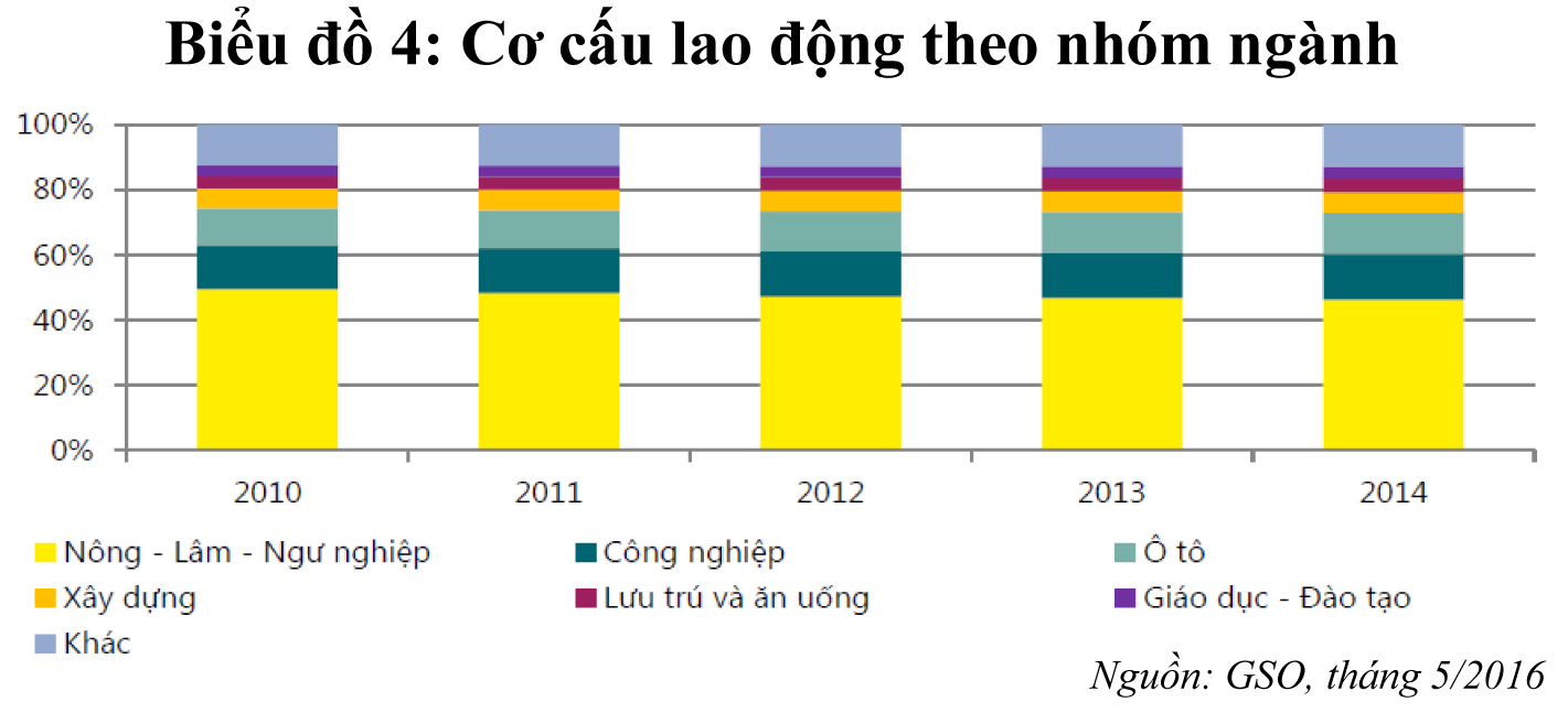 Phân bổ nhân lực. Trong giai đoạn 2010-2014, Việt Nam có tăng trưởng việc làm dương nhờ số lao động tại các ngành tăng nhiều hơn số mất việc và thất nghiệp, tỷ lệ thất nghiệp giảm một điểm phần trăm xuống 3,4%. Khoảng 50% dân số Việt Nam làm việc trong nhóm ngành nông - lâm - ngư nghiệp và khai khoáng, giảm 2%/năm, nhóm công nghiệp chế tạo (30%) và dịch vụ (20%) tăng khoảng 2%/ năm (Biểu đồ 4).
