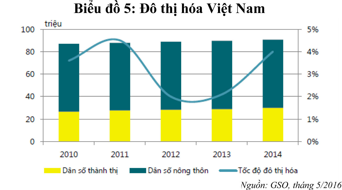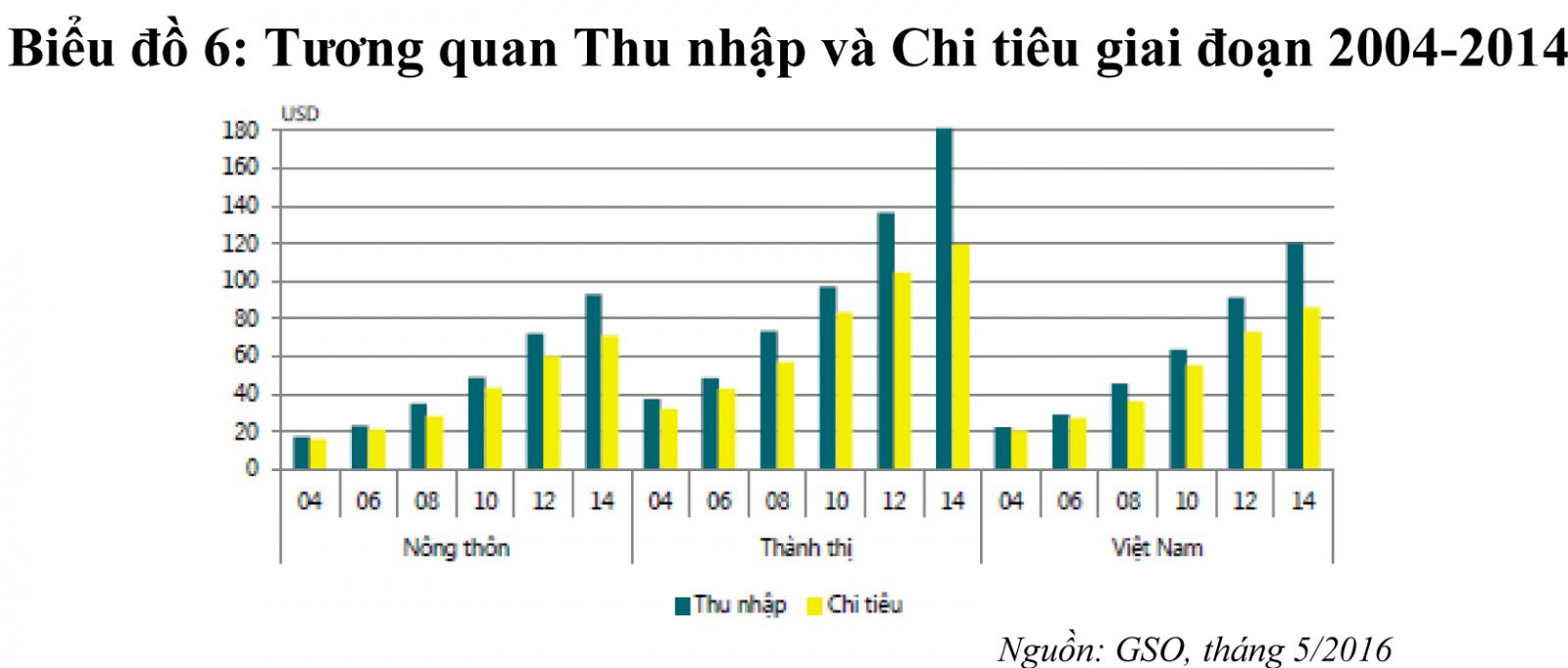 Thu nhập và Chi tiêu. Theo Savills, từ năm 2004, chi tiêu trung bình hàng tháng của Việt Nam đã tăng 16% mỗi năm. Mức tăng vùng đô thị thấp hơn 2 điểm phần trăm so với mức tăng trung bình; dân số nông thôn chiếm 2/3 tổng dân số Việt Nam. Trong năm 2004, chi tiêu bình quân của một người dân chiếm 92% tổng thu nhập hằng tháng, trong khi năm 2014 ở mức 72% (Biểu đồ 6).