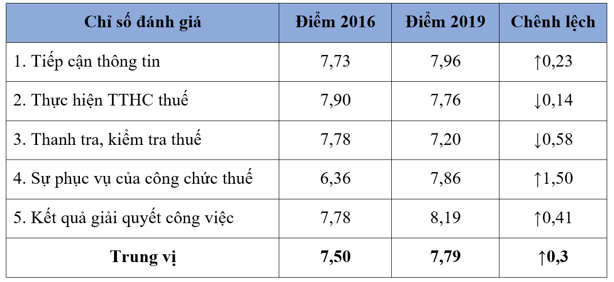 Chỉ số “Sự phục vụ của công chức Thuế” năm 2019 đã được doanh nghiệp đánh giá có nhiều chuyển biến tích cực hơn hẳn so với những cuộc khảo sát trước đây (2014: 5,36 điểm; 2016: 6,36 điểm; 2019: 7,86 điểm).
