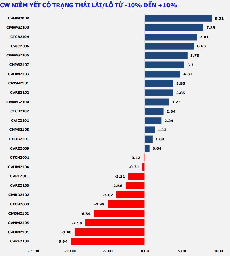 Dừng lúc đóng cửa, đã có hơn 27,80 triệu chứng quyền được chuyển nhượng thành công với giá trị giao dịch đạt khoảng 191,58 tỷ đồng. So với phiên ngày hôm qua, khối lượng CW giảm 29,3% và giá trị giao dịch giảm 2,5%. Thanh khoản thị trường thấp hơn so với bình quân 5 phiên trước đó 6,2% về khối lượng nhưng vẫn cao hơn 8% về giá trị. Tỷ lệ tăng/giảm đạt 83%, đã có 68 mã CW tăng giá, trong khi chỉ có 9 mã giảm giá và 5 mã giữ tham chiếu.