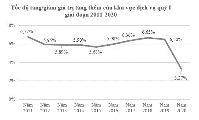 Trong những tháng đầu năm 2020, dịch Covid-19 đã ảnh hưởng nghiêm trọng đến hoạt động dịch vụ. Theo Tổng cục Thống kê, khu vực dịch vụ trong quý I/2020 chỉ tăng 3,27%, đây là mức tăng thấp nhất so với cùng kỳ các năm trong giai đoạn 2011-2020 (Hình).