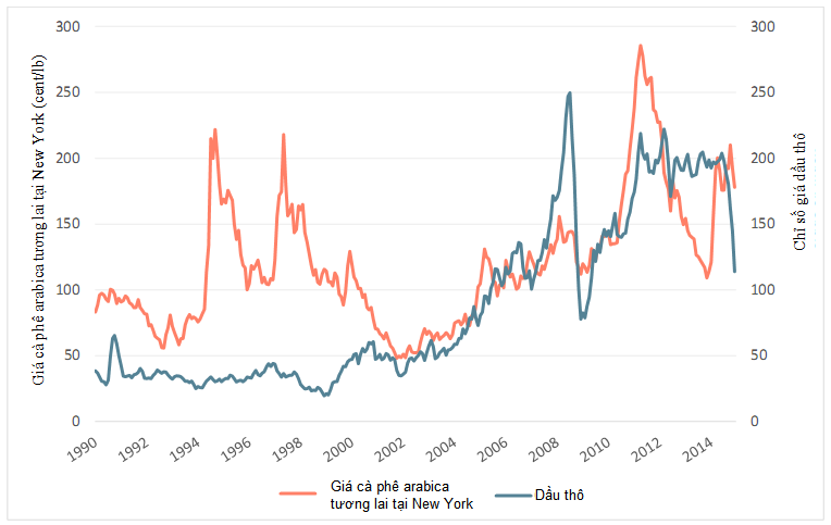 Biểu đồ 1: Chỉ số giá dầu thô và giá cà phê arabica tương lai tại New York – Nguồn: ICO