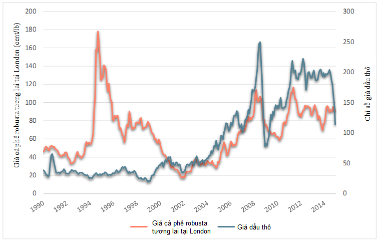 Để hiểu rõ hơn về mối tương quan giữa giá dầu và giá cà phê, chúng ta hãy tham khảo biểu đồ thể hiện mối tương quan giữa giá dầu với giá cà phê arabica tương lai tại New York và giá cà phê robusta tại London. Chỉ số giá dầu thô đuợc sử dụng làm giá tham chiếu cho các sản phẩm dầu. Biểu đồ 1 và 2 ở đây thể hiện diễn biến giá chỉ số dầu thô có mối tương quan tương đối cao với mức giá trung bình hàng tháng của cà phê arabica tương lai tại New York và cà phê robusta tương lai tại London trong giai đoạn 1990 – 2014.