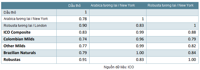 Các chuyên gia ICO cũng đưa ra phân tích dữ liệu giai đoạn từ tháng 1/2002 - tháng 12/2014 cho thấy hệ số tương quan đáng kể giữa giá cà phê và chỉ số giá dầu thô, theo bảng dưới đây.