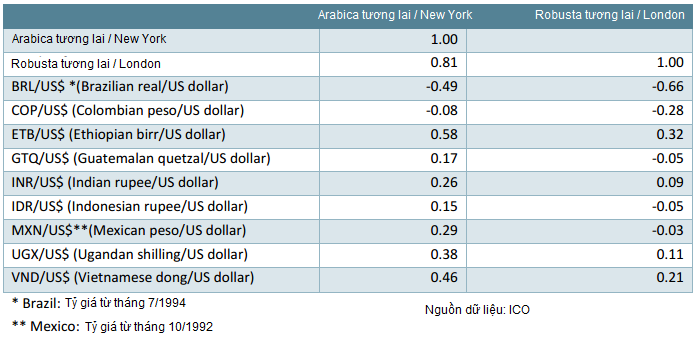 Theo bảng dữ liệu ở trên thì có nhiều hệ số tương quan âm khá mạnh giữa giá cà phê và tỷ giá hối đoái tham chiếu đồng USD. Đáng chú ý có đồng EUR, đồng BRL (real của Brazil) và đồng COP (peso của Colombia). Nói cách khác, đồng USD tăng giá so với các đồng tiền này thường đi kèm với đà giảm giá của giá cà phê. Ngoài ra, mối tương quan này thể hiện khá mạnh khi tham chiếu đồng tiền của các nước Ethiopia, Mexico, Uganda và Việt Nam, cho thấy tỷ giá hối đoái các đồng tiền này so với đồng USD và giá cà phê thường cùng xu hướng. Tuy nhiên, tỷ giá hối đoái các đồng tiền của các nước khác (Guatemala, Ấn Độ và Indonesia) so với đồng USD không thể hiện mối tương quan mạnh đối với giá cà phê.