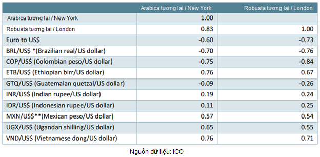 Bảng dưới đây cho biết hệ số tương quan giữa giá cà phê và các cặp tỷ giá giữa đồng USD so với các đồng tiền của 9 nước xuất khẩu cà phê hàng đầu thế giới (giai đoạn 1990 - 2014).