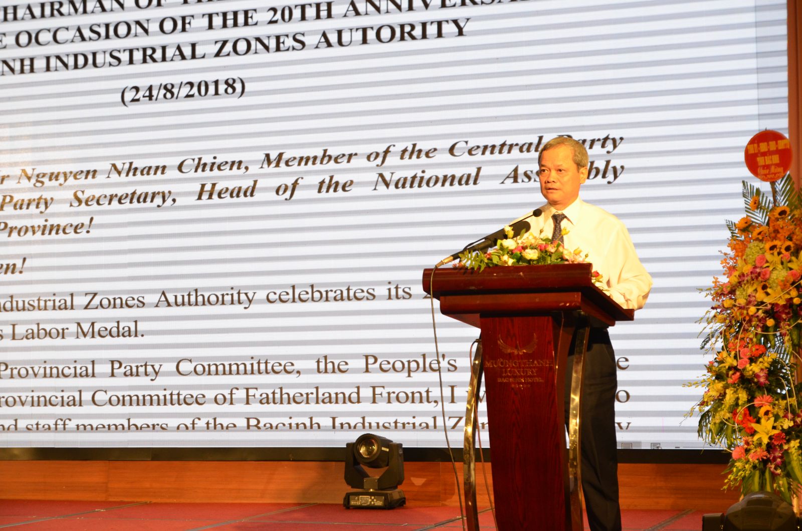 Thay mặt lãnh đạo tỉnh Bắc Ninh, Chủ tịch UBND tỉnh Bắc Ninh Nguyễn Tử Quỳnh chúc mừng, ghi nhận và biểu dương những cố gắng nỗ lực mà CBCC-VC và người lao động Ban Quản lý các KCN Bắc Ninh đã đạt được trong suốt chặng đường 20 năm xây dựng và phát triển các KCN.
