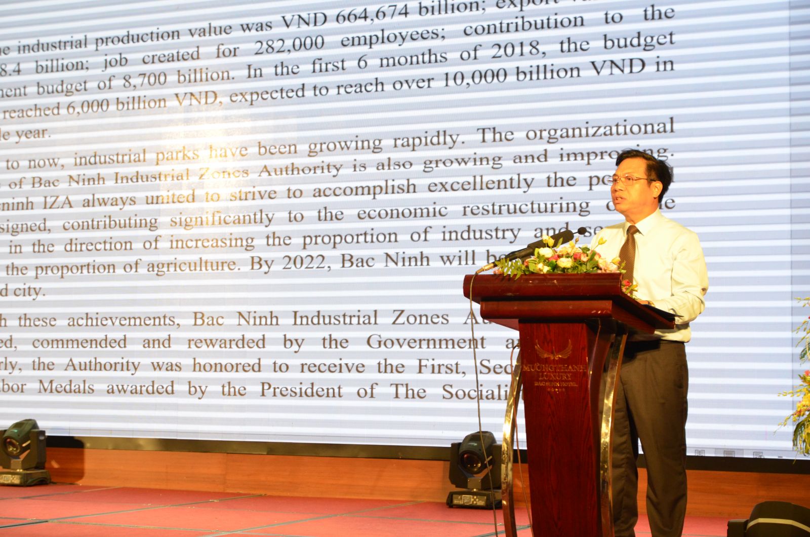 Phát biểu khai mạc Hội nghị, ông Bùi Hoàng Mai - Trưởng ban Quản lý các KCN tỉnh Bắc Ninh đánh giá khái những thành tựu mà Ban Quản lý các KCN tỉnh Bắc Ninh đã đạt được trong chặng đường 20 năm xây dựng và phát triển các KCN, đồng thời bày tỏ sự cảm ơn sâu sắc về sự quan tâm giúp đỡ và chỉ đạo nhiệt tình, hiệu quả của lãnh đạo UBND tỉnh Bắc Ninh và các Bộ, ngành Trung ương trong suốt 20 năm qua.