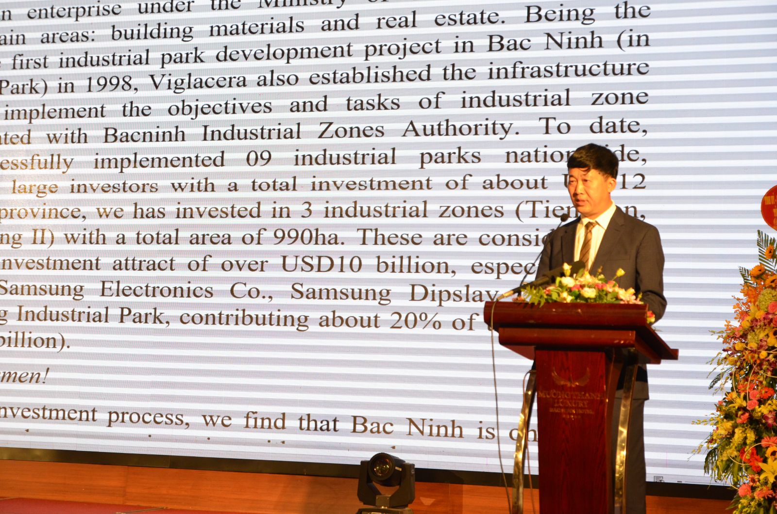 Phó tổng giám đốc Ngọc Anh tự hào chia sẻ, Viglacera là đơn vị triển khai dự án KCN tập trung đầu tiên tại Bắc Ninh (KCN Tiên Sơn) năm 1998, cũng là năm Viglacera thành lập đơn vị đầu tư hạ tầng để triển khai nhiệm vụ phát triển KCN cùng với Ban Quản lý các KCN tỉnh Bắc Ninh. Đến nay, Viglacera đã triển khai thành công 9 KCN trên cả nước, thu hút gần 250 nhà đầu tư lớn với tổng mức đầu tư hơn 12 tỷ USD. Trong đó tại Bắc Ninh đã đầu tư hạ tầng 03 KCN (Tiên Sơn, Yên Phong, Thuận Thành) với tổng diện tích khoảng 1000 ha. Đây được xem là KCN kiểu mẫu và thu hút đầu tư đạt hơn 10 tỷ USD, đặc biệt có các doanh nghiệp thương hiệu lớn như Công ty TNHH Samsung Electronics, Samsung Dipslay đã đầu tư vào KCN Yên Phong với vốn đầu tư lớn, đóng góp khoảng 20% giá trị kim ngạch xuất khẩu của cả nước (28 tỷ USD).
