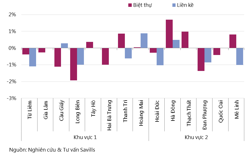 Giá sơ cấp bình quân tăng 1% theo quý, trong khi đó, giá chào bán thứ cấp bình quân tăng 2% theo quý. Tại một số quận (như Tây Hồ, Hoàn Kiếm) giá thứ cấp tăng 7% theo quý, trong khi mức giảm cao nhất chỉ là -4% theo quý ở các quận Ba Đình và huyện Đan Phượng.