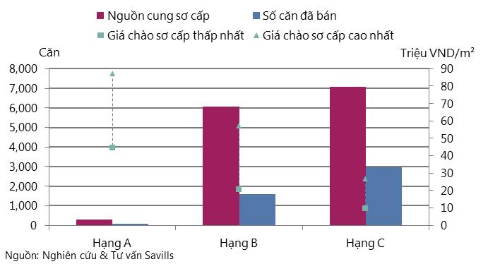 Đối với phân khúc căn hộ để bán, báo cáo cho thấy, trong quý 02/2015, thị trường bất động sản có hơn 4.630 căn hộ đã được bán, giảm -18% theo quý. Tỷ lệ hấp thụ đạt 34%, giảm -9 điểm % theo quý.