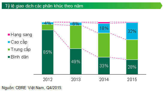 Mặc dù quý IV, phân khúc nhà ở có số căn mở bán thấp hơn Quý III, nhưng tính tổng cả năm 2015 có 28.300 căn đã được chào bán, tăng 70% so với năm 2014. Đáng chú ý, trong năm nay, phân khúc căn hộ cao cấp đã trở lại với tỷ lệ tăng mạnh trong cả lượng mở bán và giao dịch. Căn hộ cao cấp chiếm tỷ trọng 28% trong tổng số căn chào bán mới, cao hơn so với mức 21% trong năm đỉnh điểm 2011 về mở bán. Theo vị trí, tỷ lệ mở bán mới tại khu phía Nam (quận Hoàng Mai) và rìa trung tâm (quận Hai Bà Trưng) tăng mạnh, chiếm tới 50% lượng mở bán, tỷ lệ này trước đây luôn thấp hơn khu phía Tây và Tây Nam với nhiều hạ tầng đang được triển khai. Lượng mở bán mới từ khu phía Tây và Tây Nam chiếm 46%, thấp hơn các năm trước khi thường trên 50%.