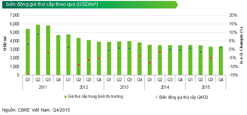 Giá bình quân cả sơ cấp và thứ cấp được cải thiện qua các quý trong năm, với mức tăng trung bình. Nhìn chung, giá mở bán các dự án mới tăng khoảng 3%-5% so với năm trước, cá biệt một số dự án cao cấp có mức tăng giá 5%-7% tại một số đợt mở bán sau. Về giá thứ cấp, toàn thị trường ghi nhận mức tăng nhẹ 0,3% theo quý và 1,1% theo năm (theo đồng USD).