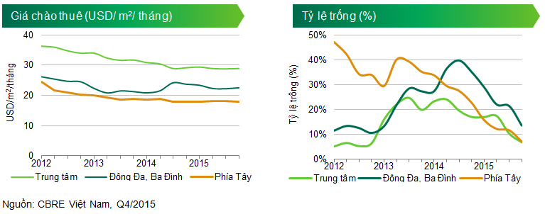Năm 2015, các tòa nhà Hạng A và Hạng B đều ghi nhận mức cải thiện đáng kể về tỷ lệ lấp đầy. Trong khi Hạng A có tỷ lệ lấp đầy tăng 5,5 điểm phần trăm so với quy trước, đạt 87,8% thì Hạng B tăng 1,2 điểm phần trăm lên 89,1%. Mức cải thiện lớn nhất được ghi nhận tại khu vực Đống Đa, Ba Đình với mức tăng 7,98 điểm phần trăm. Khu vực trung tâm và phía Tây cũng có tỷ lệ trống cải thiện lần lượt là 3,5 và 4,5 điểm phần trăm so với quý trước. Trong quý IV/2015 có, 29.345 m² văn phòng Hạng A đã được hấp thụ, trong khi Hạng B là 28.240 m².