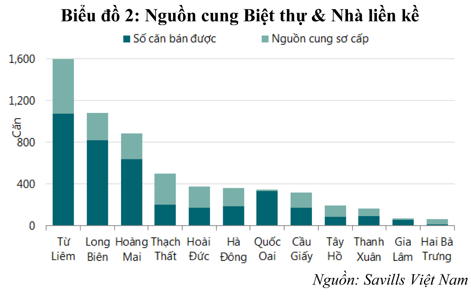 Quý II/2016, tổng nguồn cung phân khúc biệt thự /nhà liền kề đạt 32.620 căn (2.396 sơ cấp và 30.224 thứ cấp), tăng 7% theo quý và 11,2% theo năm. Sáu dự án mới và nguồn cung bổ sung từ một dự án hiện tại cung cấp tổng cộng 908 căn - mức cung mới theo quý cao nhất trong vòng hai năm gần đây. Quận Hà Đông tiếp tục dẫn đầu nguồn cung với 26% thị phần. Trong nửa cuối năm 2016, dự kiến có khoảng 1.200 căn sẽ gia nhập thị trường.
