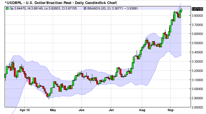Đồng Real khởi đầu tháng 9 bằng dao động giảm mạnh xuống mức thấp nhất mới so với đồng USD trong vòng hơn 12 năm qua sau khi số liệu sản lượng công nghiệp tháng 7 của Brazil công bố kết quả xấu hơn kỳ vọng với mức giảm 1,5% và Ngân hàng Trung ương Brazil (BCB) duy trì lãi suất cơ bản không đổi ở mức 14,25%, sau 7 lần tăng lãi suất cơ bản liên tục với nỗ lực ngăn chặn lạm phát leo thang.