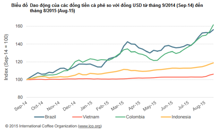 Theo báo cáo định kỳ tháng 9 của Tổ chức Cà phê Quốc tế (ICO), trong năm qua, các đồng tiền tại một số nước xuất khẩu, đáng chú ý nhất là Brazil và Colombia, đã giảm giá đáng kể so với đồng USD, theo minh họa ở biểu đồ bên dưới. Kể từ tháng 9/2014, đồng Real của Brazil (BRL) và đồng peso của Colombia (COP) đều giảm giá hơn 50%, phản ánh tình hình kinh tế trong nước suy thoái cũng như các khuynh hướng kinh tế vĩ mô toàn cầu suy giảm.