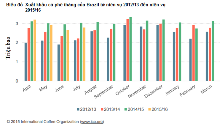 Nguyên nhân xuất khẩu cà phê tăng như vậy là do sử dụng nguồn cà phê dự trữ tích lũy qua hai mùa trước đó, tỷ giá hối đoái đồng real giảm khuyến khích khối lượng xuất khẩu tăng. Theo biểu đồ dưới đây, khối lượng xuất khẩu cà phê tháng qua 3 tháng gần nhất giảm nhẹ so với cùng kỳ năm ngoái, nhưng vẫn cao hơn so với niên vụ 2012/13 và niên vụ 2013/14.