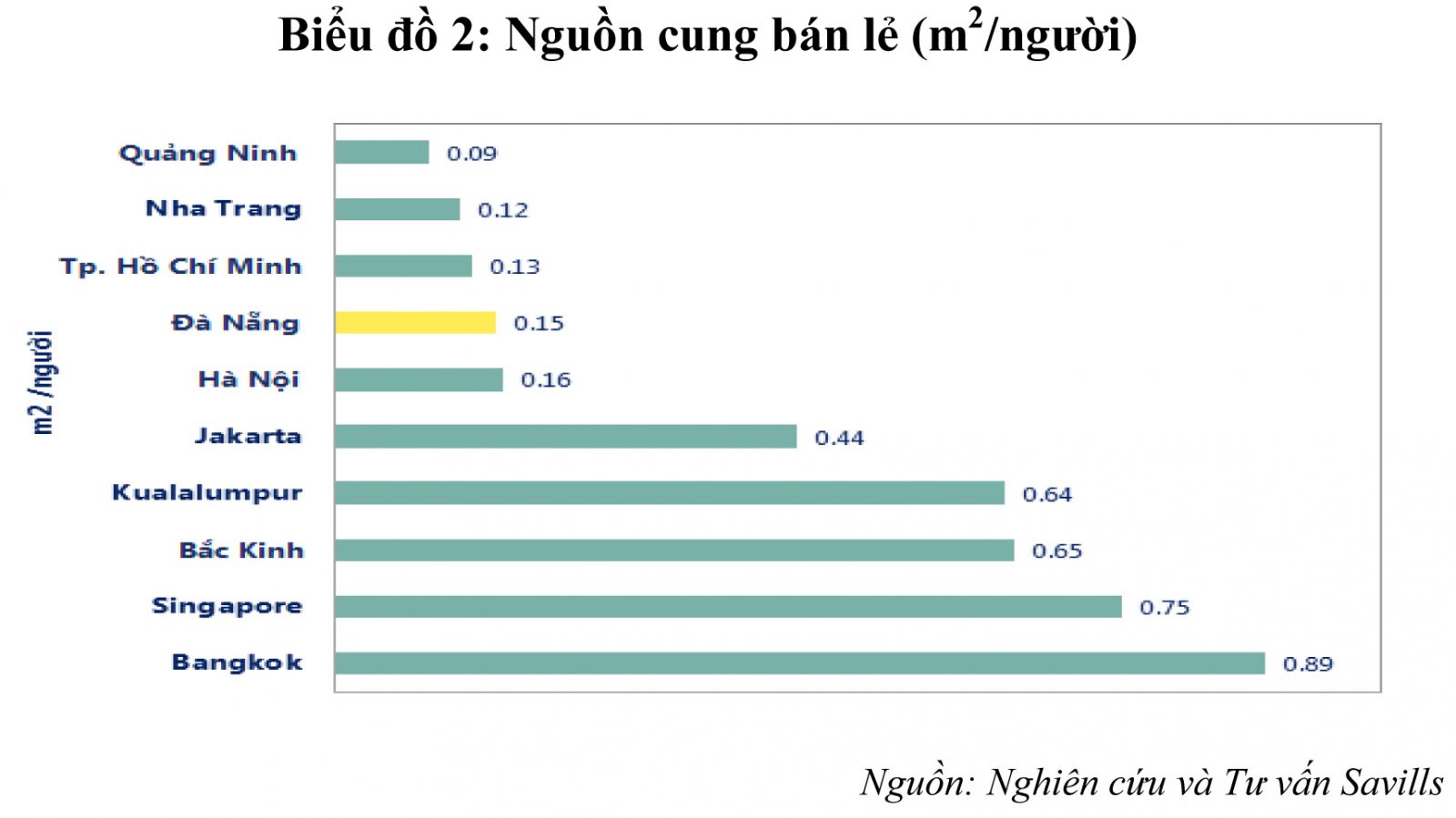 Tại phân khúc bán lẻ, trong nửa đầu năm 2016, mật độ mặt bằng bán lẻ đạt 0,15m2/người, tương đương với các thành phố khác tại Việt Nam. Tuy nhiên, vẫn thấp hơn nhiều so với các khu vực, như: Jakarta, Kuala Lumpur, Singapore và Bangkok. Do đó, Savills cho rằng, đây là cơ hội để thị trường bán lẻ tại Đà Nẵng phát triển lâu dài trong tương lai.