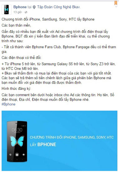 Ngày 25/1, trên fanpage Facebook chính thức Bphone của Bkav bất ngờ thông báo về việc tung ra chương trình đổi điện thoại lấy Bphone.
