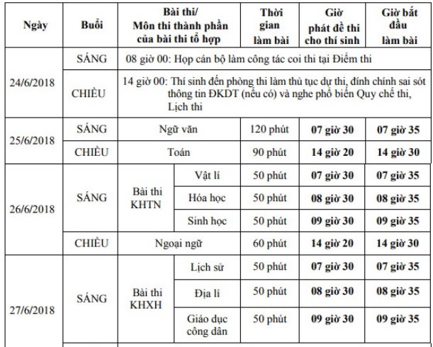 So với năm 2017, Kỳ thi THPT quốc gia 2018 sẽ bắt đầu muộn hơn 3 ngày. Như vậy, bắt đầu từ chiều 24/06, thí sinh sẽ đến phòng làm thủ tục dự thi, đính chính sai sót thông tin đăng ký dự thi và nghe phổ biến quy chế thi, lịch thi. Ngày thi đầu tiên sẽ bắt đầu từ sáng 25/06, thí sinh sẽ làm bài hai môn Văn, Toán. Ngày tiếp theo, các em làm bài thi Khoa học tự nhiên và Ngoại ngữ. Sáng 27/06, thí sinh sẽ làm nốt bài thi Khoa học xã hội.