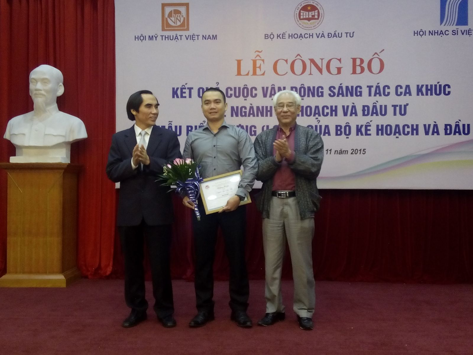 Thứ trưởng Nguyễn Văn Trung và nhạc sĩ Đỗ Hồng Quân trao giải nhất cho tác giả ca khúc Bài ca ngành Kế hoạch và Đầu tư