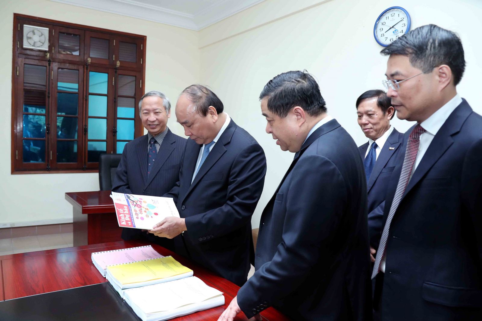 Trước đó, khi đi thăm phòng làm việc của Tổ biên tập văn kiện Đại hội Đảng, Thủ tướng đã xem ấn phẩm chào mừng Xuân Kỷ Hợi của Tạp chí Kinh tế và Dự báo/ Ảnh: Đức Trung