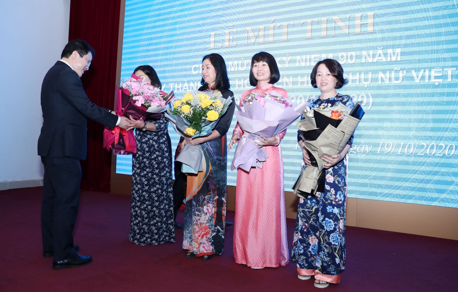 Thứ trưởng Trần Quốc Phương tặng hoa chúc mừng các chị em phụ nữ. Ảnh: Minh Hậu