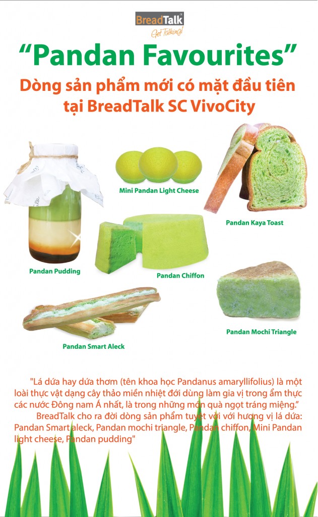 “Pandan Favourites” ra mắt đầu tiên tại BreadTalk SC VivoCity. Tổng cộng 9 món ăn được làm từ là dứa xanh mát và thơm lừng. Trong đó sản phẩm nổi bật là “Pandan Pudding”, pudding lạnh nhân lá dứa, vị ngọt thanh mát lạnh, một món ăn rất thích hợp với không khí hè nóng bức. Nào còn chờ gì nữa, mời bạn hãy đến tham gia chương trình dùng thử các sản phẩm mới của BreadTalk tại SC VivoCity, diễn ra mỗi thứ 6, thứ 7 và chủ nhật hàng tuần trong suốt 2 tháng khai trương, và cùng nhiều Chương trình ưu đãi hấp dẫn khác nữa.