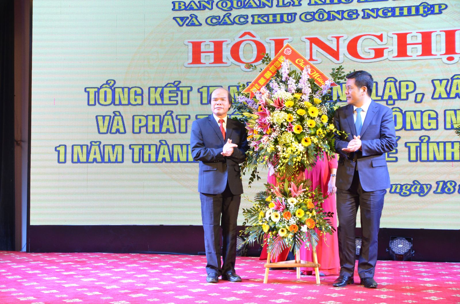 Bí thư Tỉnh ủy tỉnh Thái Bình Nguyễn Hồng Diên tặng hoa chúc mừng Ban Quản lý KKT và các KCN tỉnh Thái Bình