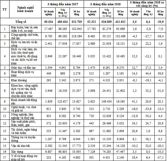 Tính chung 5 tháng đầu năm nay, cả nước có 52.322 doanh nghiệp thành lập mới với số vốn đăng ký là 516.859 tỷ đồng, tăng 3,5% về số doanh nghiệp và tăng 6,4% về số vốn so với cùng kỳ năm 2017. Tỷ trọng vốn đăng ký bình quân trên một doanh nghiệp trong 5 tháng đầu năm 2018 đạt 9,9 tỷ đồng, tăng 2,8% so với cùng kỳ năm ngoái. Số lao động đăng ký của các doanh nghiệp thành lập mới trong 5 tháng đầu năm nay là 412.612 lao động, giảm 20,9% so với cùng kỳ năm ngoái.