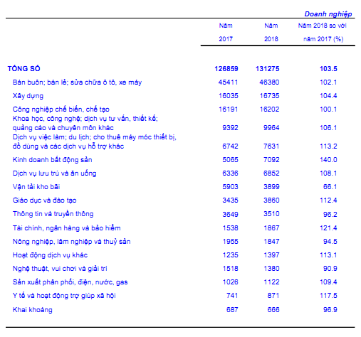 Còn theo lĩnh vực hoạt động, trong năm 2018 số doanh nghiệp thành lập mới tập trung chủ yếu ở các ngành, như: bán buôn, bán lẻ, sửa chữa ô tô, xe máy; xây dựng; công nghiệp chế biến, chế tạo; khoa học, công nghệ, dịch vụ tư vấn, thiết kế, quảng cáo và chuyên môn khác; dịch vụ việc làm, du lịch, cho thuê máy móc thiết bị, đồ dùng và các dịch vụ hỗ trợ khác; bất động sản; dịch vụ lưu trú và ăn uống; vận tải, kho bãi…