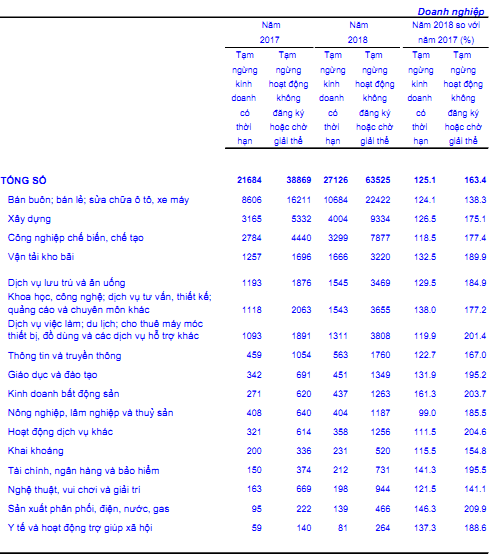 Về số doanh nghiệp tạm ngừng hoạt động trong năm 2018 là 90.651 doanh nghiệp, tăng 49,7% so với năm 2017. Trong đó, có 27.126 doanh nghiệp đăng ký tạm ngừng kinh doanh có thời hạn, tăng 25,1% và 63.525 doanh nghiệp tạm ngừng hoạt động không đăng ký hoặc chờ giải thể, tăng 63,4%.