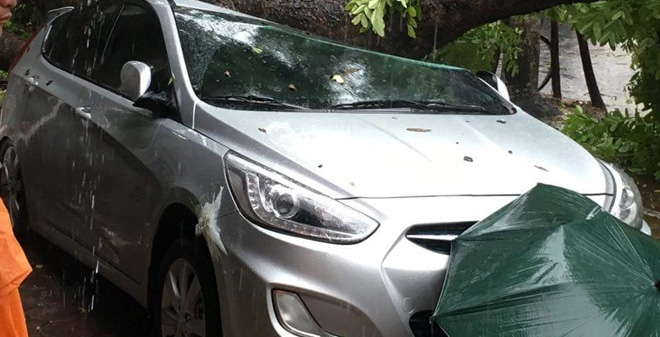 Một chiếc ô tô bị cây đè trúng trúng trên phố Hai Bà Trưng - Hà Nội