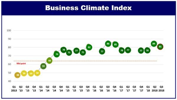 Theo đó, chỉ số BCI thể hiện niềm tin vào môi trường thương mại và đầu tư của Việt Nam, hiện tại ở mức 81 điểm, là kết quả cao thứ nhì kể từ cuối năm 2016. Mặc dù có sự sụt giảm nhẹ so với quý II/2018 – mức cao nhất trong 18 tháng qua, cảm quan kinh doanh của doanh nghiệp châu Âu trong quý III vẫn tích cực.