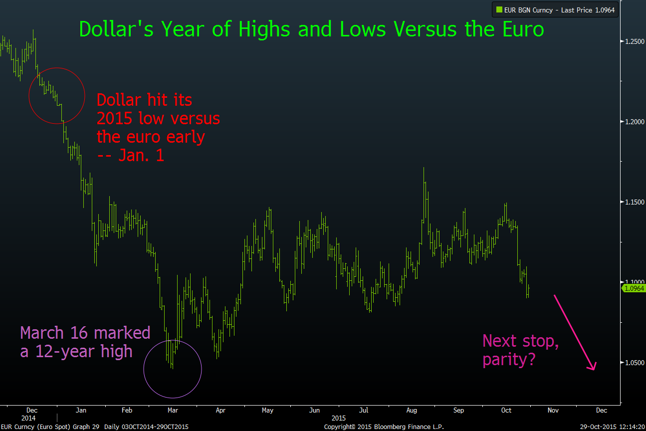 123 Global dự báo, đồng USD sẽ vươn lên ngang ngửa đồng Euro vào tháng 12 tới, khi khác biệt chính sách tiền tệ giữa Fed và ECB ngày một gia tăng. Vào lúc này, Fed nhấn mạnh việc xem xét tăng lãi suất vào cuộc họp FOMC cuối năm, còn ECB lại đang “ám chỉ” có thể tăng cường nới lỏng trong phiên họp chính sách ngày 3/12. Điều này khiến triển vọng 2 đồng tiền lớn của thế giới “ngang tài ngang sức” quay trở lại.