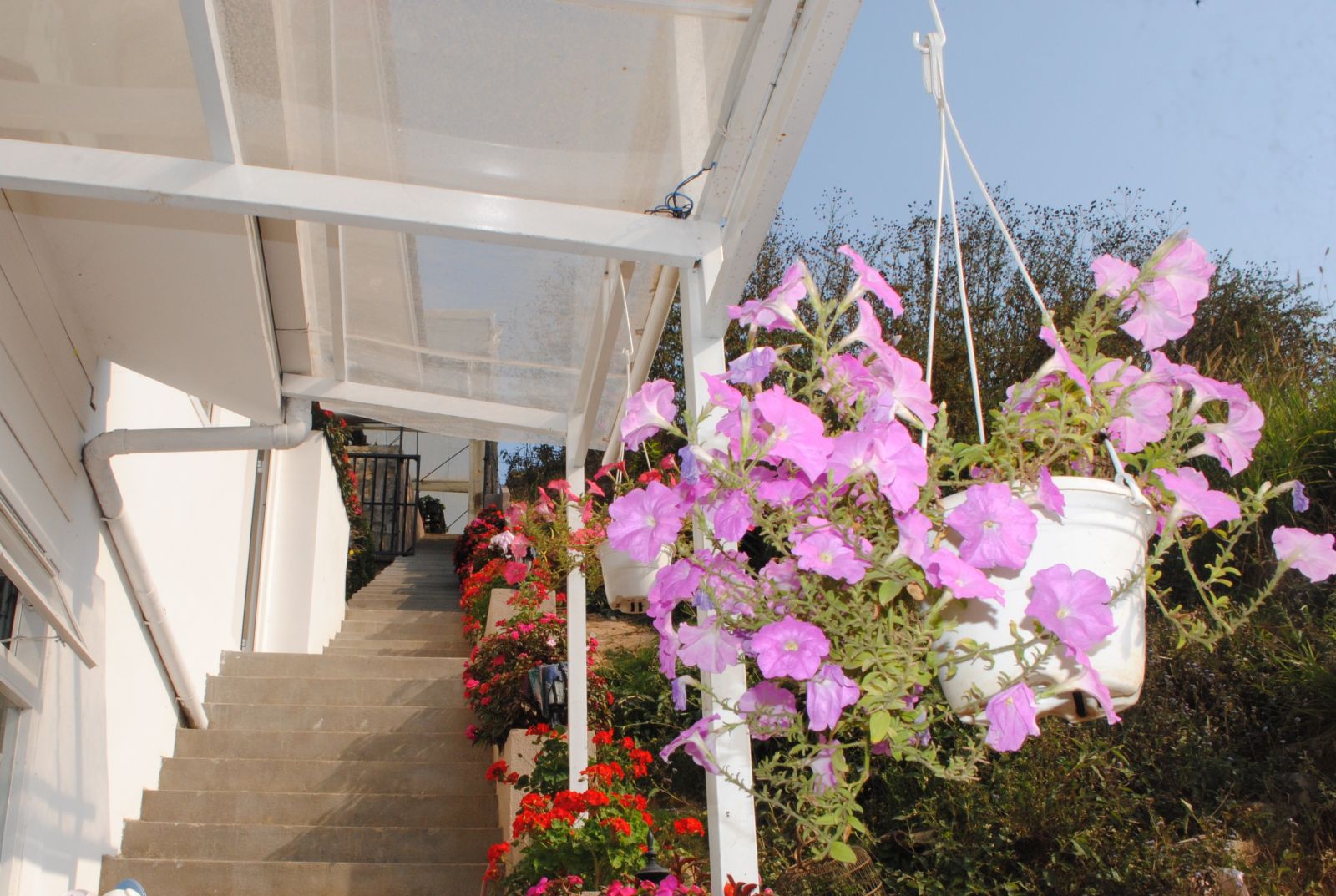 Lối vào vườn dâu được trồng rất nhiều hoa