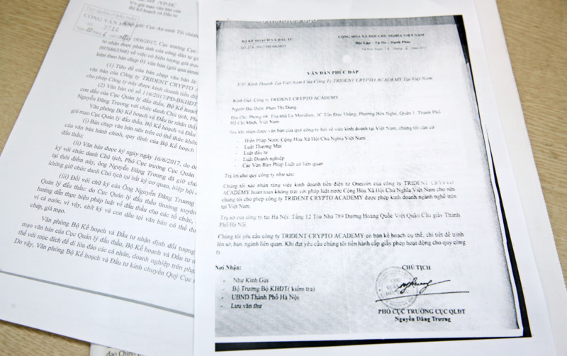 Văn bản giả mạo có số 116/2017/PĐ-BKHĐT đề ngày 16/06/2017 với nội dung Bộ Kế hoạch và Đầu tư phúc đáp văn bản của Công ty TRIDENT CRYPTO ACADEMY tại Việt Nam về việc cho phép công ty này được kinh doanh tiền điện tử Onecoin.
