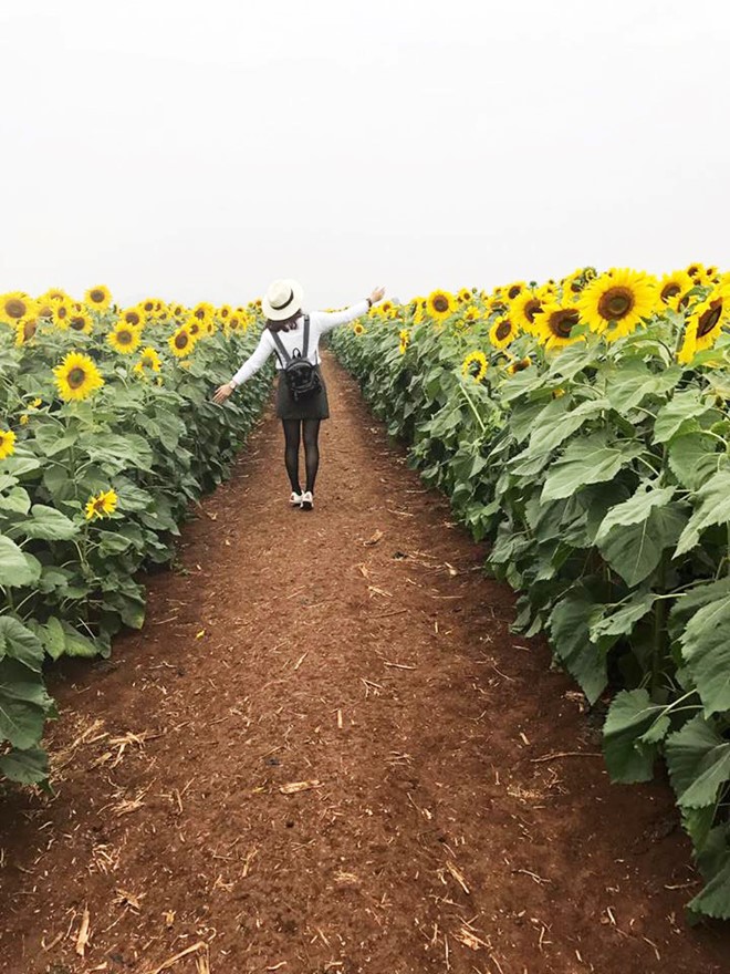 Hoa hướng dương ở đây đã được người trồng điều chỉnh nông học, kích thước vừa tầm không quá cao, nên không cần thuê thang. Nhưng nếu bạn muốn quan sát được hết vẻ đẹp bao quát, bạn có thể thuê thang với giá khoảng 30.000 đồng một tiếng . Ảnh: Trương Diệu Thơm.