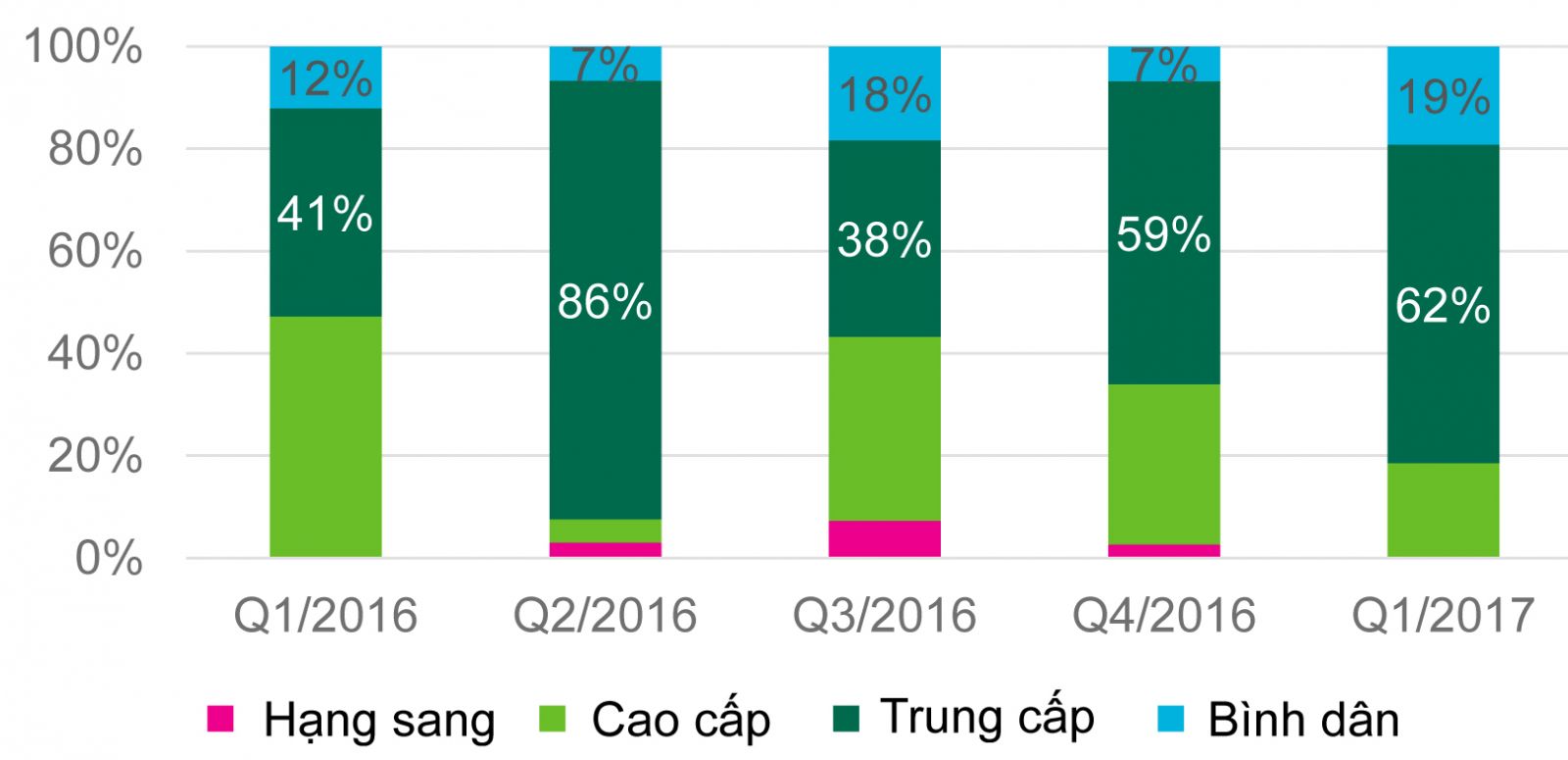 Theo báo cáo, trong quý I/2017, phân khúc căn hộ bán có 9.398 căn mở bán mới từ 35 dự án trên toàn Thành phố. Trong đó, phân khúc trung cấp chiếm lĩnh thị trường với 62% tổng nguồn cung mới, theo sau là phân khúc cao cấp và bình dân. Điều đáng chú ý là số lượng mở bán mới từ phân khúc bình dân gần gấp 3 lần số lượng tại thời điểm quý IV/2016 (Biểu đồ).
